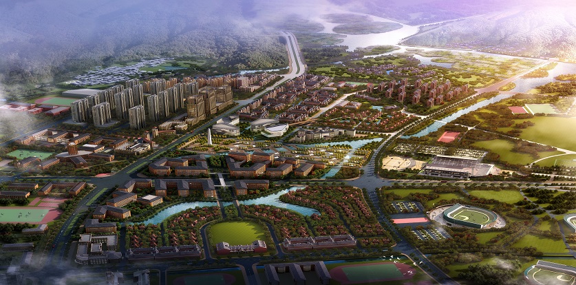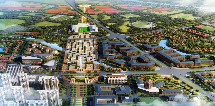四片區(qū):教學區(qū)、城鎮(zhèn)區(qū)、運動公園區(qū)、生態(tài)濕地區(qū)